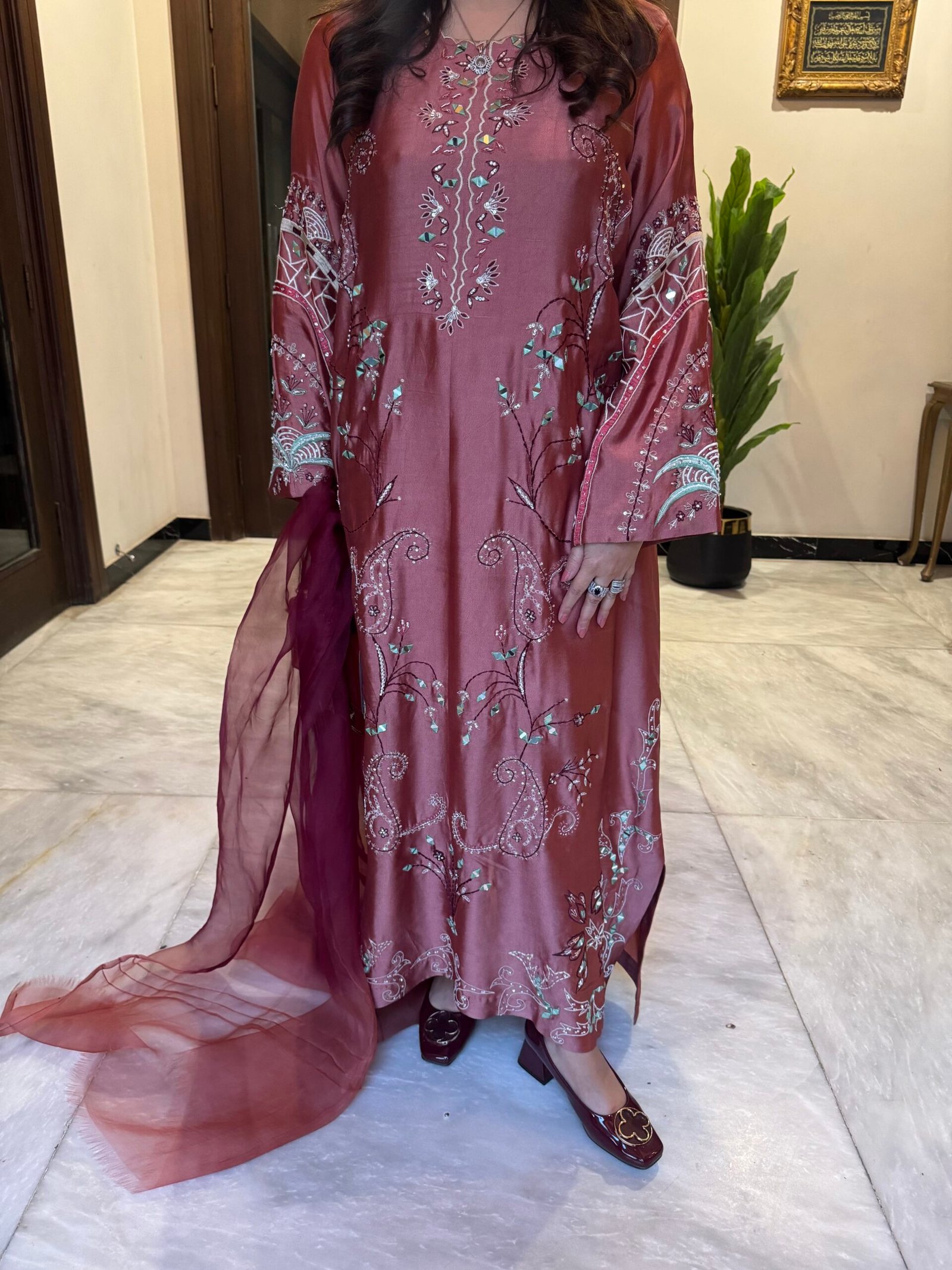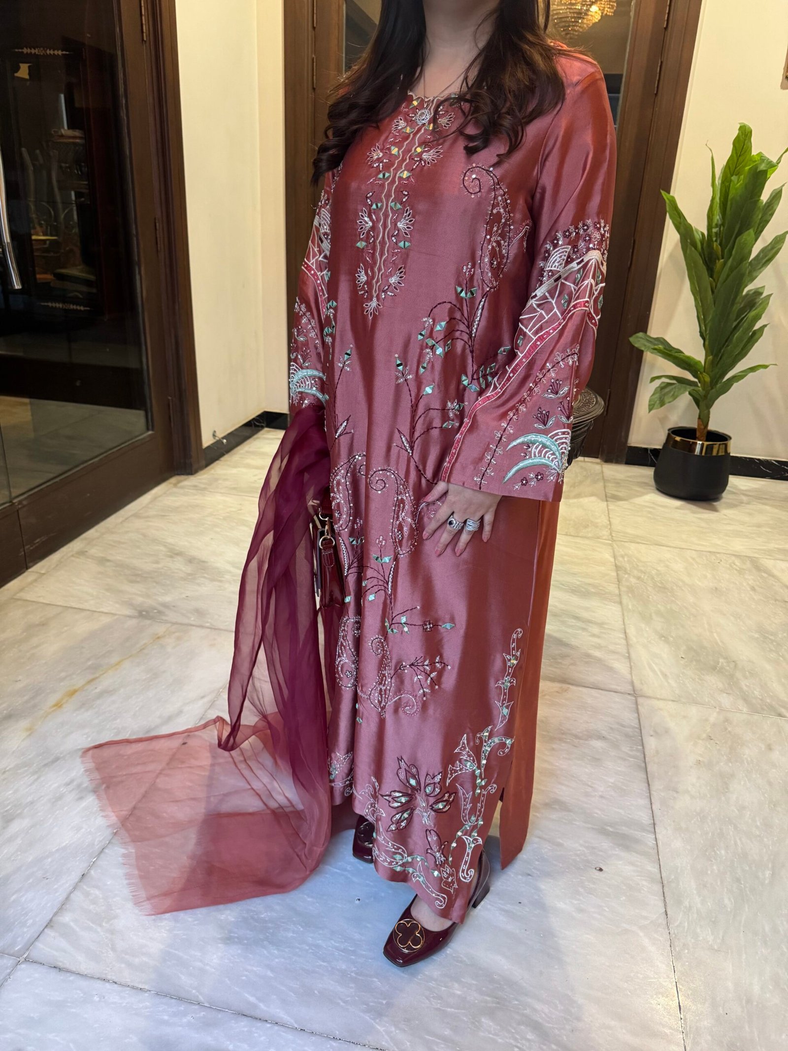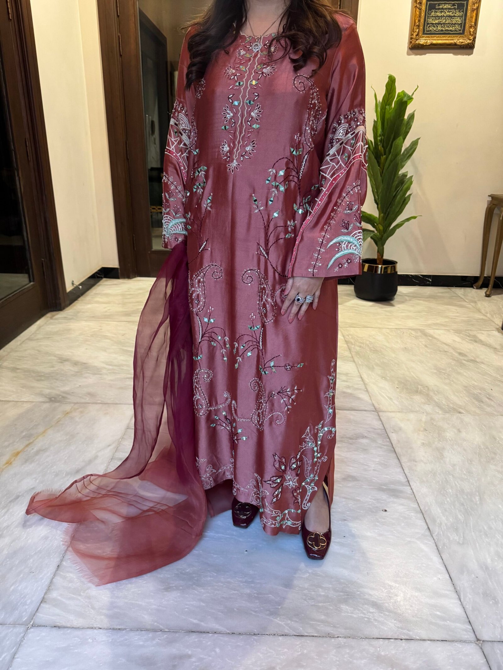 Presenting Design Drop 5, the Carrot Kaftan — a striking formal ensemble crafted to make an unforgettable statement. Made from pure Sheesha silk, this kaftan is adorned with intricate mirror detailing and exquisite hand adda work. The design features delicate resham embroidery, enhanced with stones, dapka, cora, and pearls, creating a rich and luxurious finish. The vibrant carrot hue adds warmth and elegance, perfect for festive celebrations and special occasions. Paired with a two-tone organza dupatta, this outfit beautifully blends traditional craftsmanship with refined sophistication for a truly elevated formal look.
